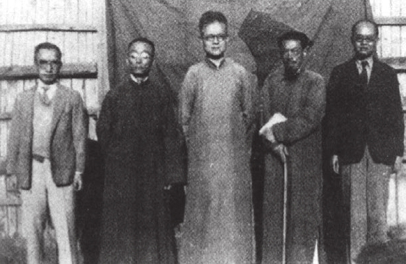 西南联大文学系部分教授合影(左起:朱自清、罗庸、罗常培、闻一多、王力)