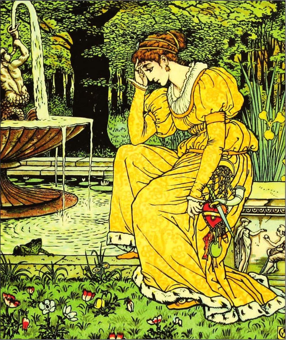 “哦,亲爱的爸爸,我昨天到森林里去,坐在井边玩,不小心把我的金球掉进了井里。因为我哭得很伤心,那只青蛙就把金球给我捞了上来。它当时要我答应它做我的伙伴,可是我根本没想到,它能从井里爬上来。它现在就在门外,要进来找我。”