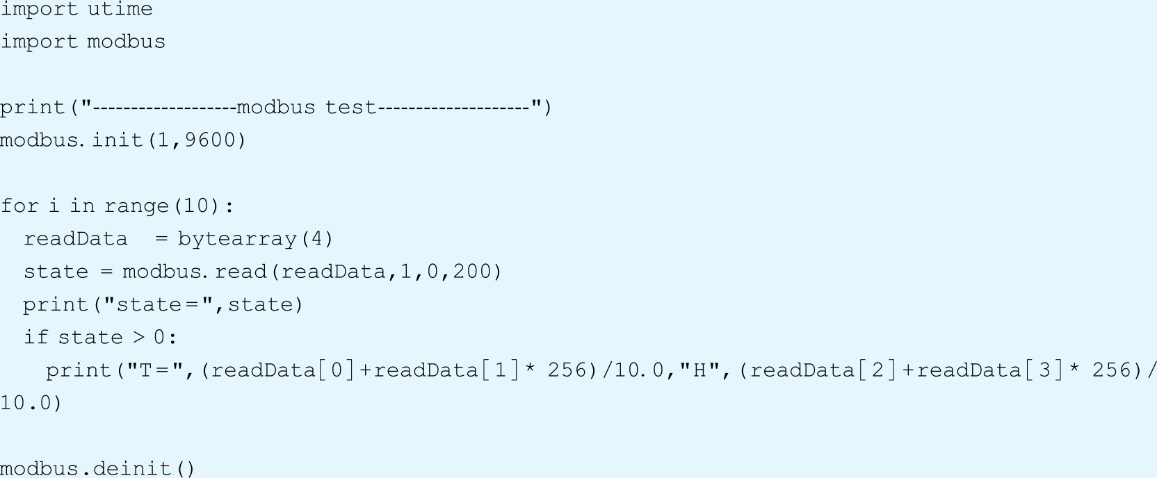 读取YF3610-TH21温湿度模块的值,主要会用到modbus.init、modbus.deinit和modbus.read这三个函数。相关代码如下: