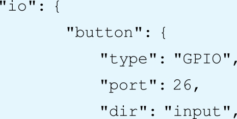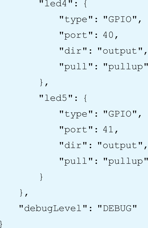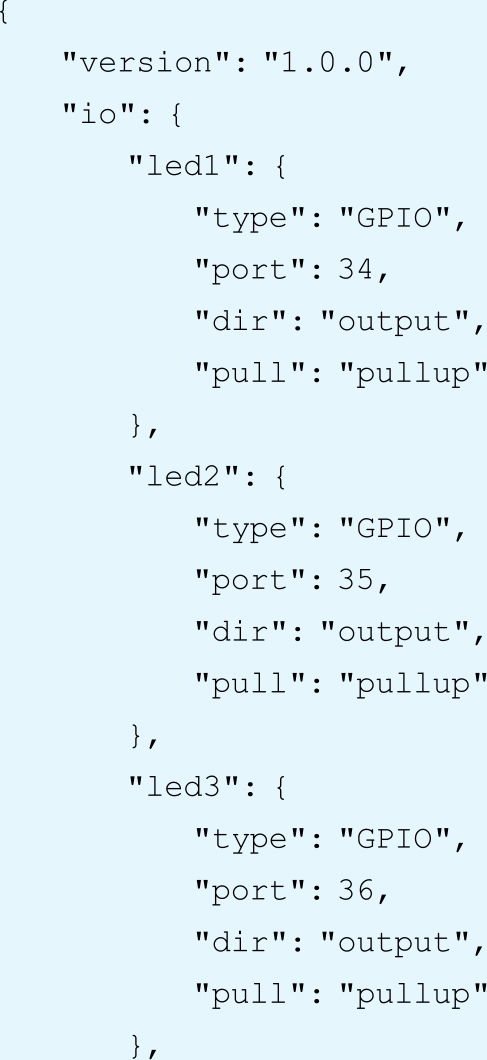 这里依然操作图1.4.1所示的LED和用户按钮。和MicroPython轻应用一样,我们需要配置app.json文件,其文件和MicroPython中配置的board.json文件相同,配置如下: