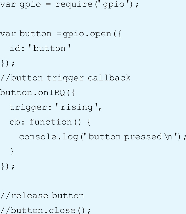 JavaScript轻应用也提供了GPIO的驱动库,支持如下几个主要函数,分别如下:
