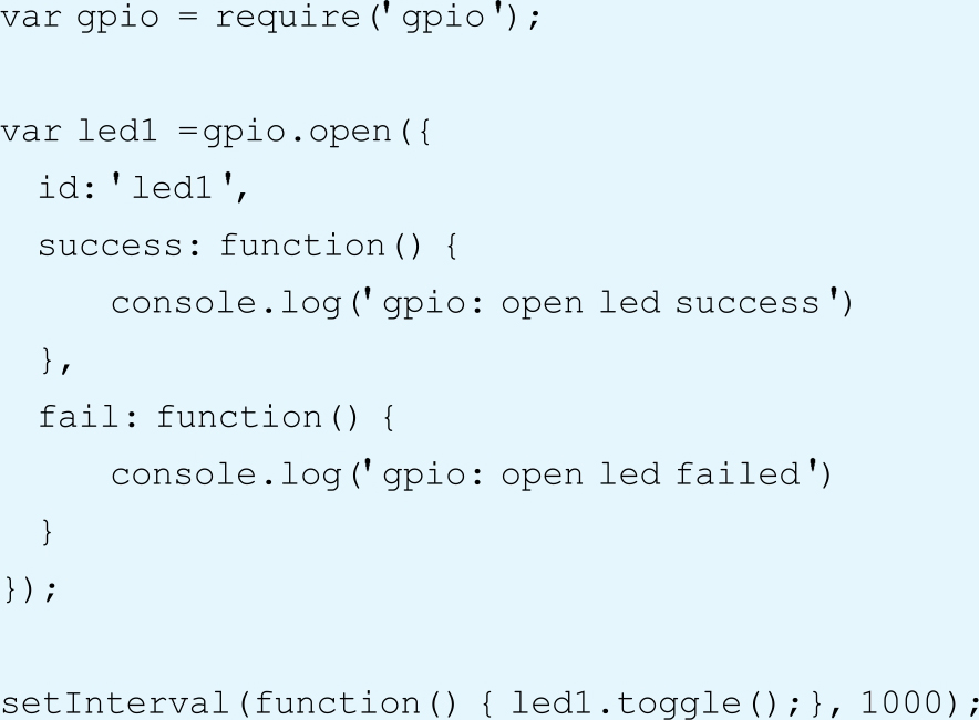 我们编写一个每隔一秒LED闪烁一次的JavaScript轻应用,相关代码如下: