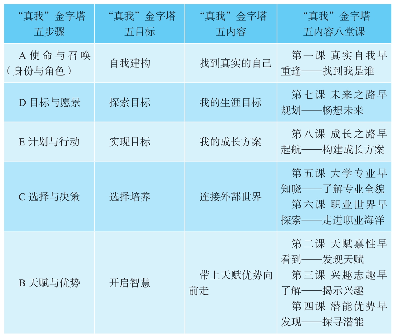 “真我”金字塔模型的五步骤对应的五目标,以及相应的五内容,我们通过设计八堂课来实现目标。课与课之间承上启下、连贯成体。