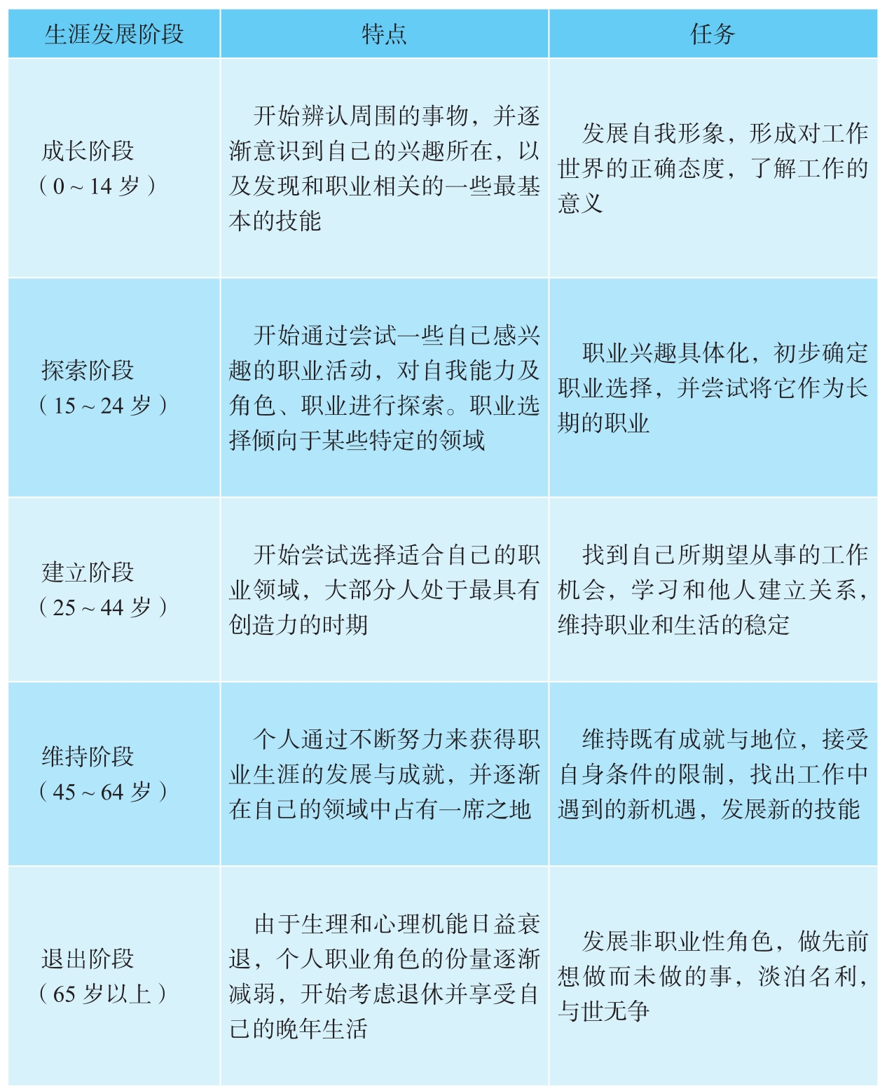 舒伯将生涯发展阶段划分为成长、探索、建立、维持与退出五个阶段。
