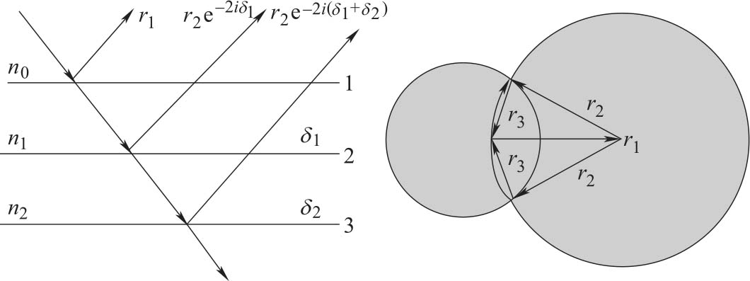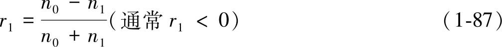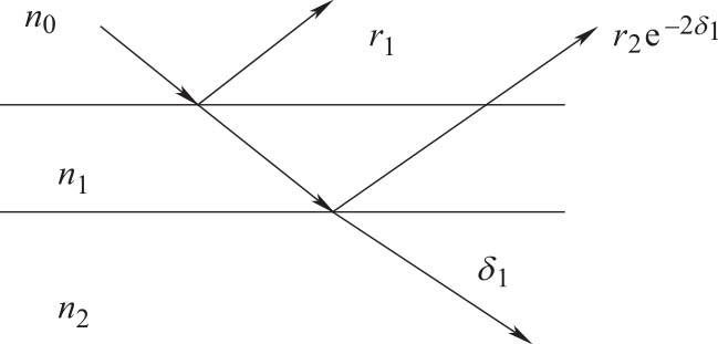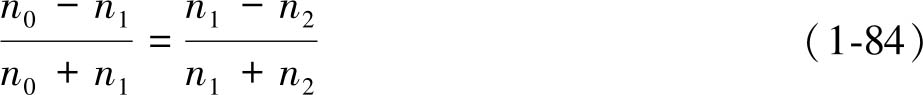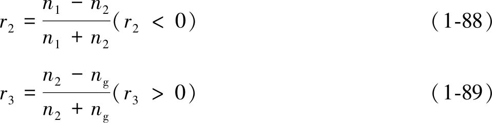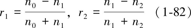 图1-8所示, n 0 和 n g 分别为入射介质和基片的折射率。 n 1 和 n 2 为折射率已确定的低折射率和高折射率材料的膜层, δ 1 和 δ 2 便是特定的膜层位相厚度,以使波长 λ 0 的反射光能减至零。已知各界面上的振幅反射系数分别为