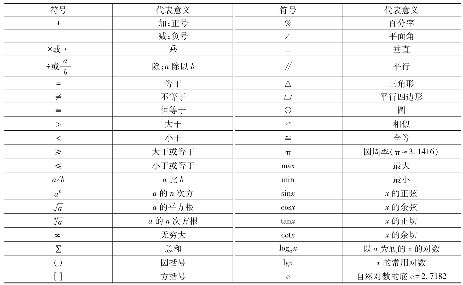 按GB 3102.11—1993《物理科学和技术中使用的数学符号》,常用数学符号见表2-1。