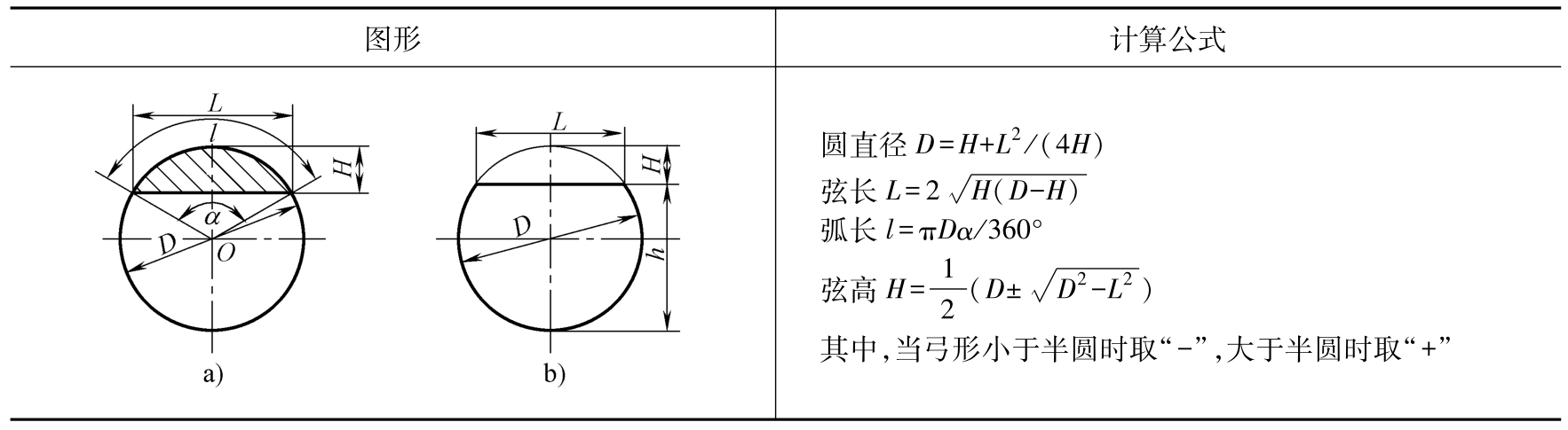 表2-5 弓形尺寸计算