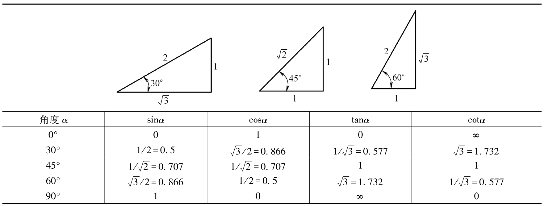 注:其中0°~90°之间的各三角函数数值可从有关的数学手册中查取。