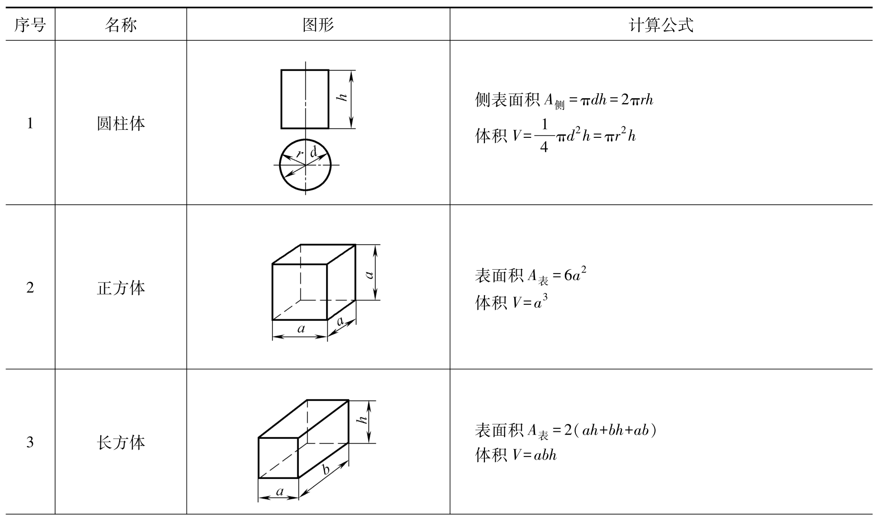 表2-6 各种几何形体的表面积和体积的计算方法