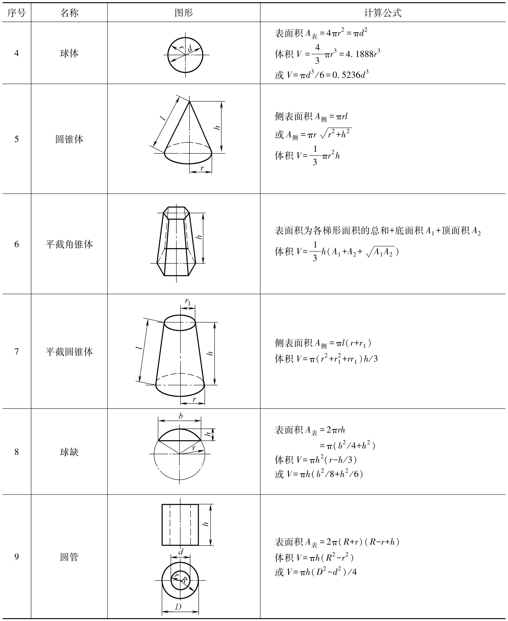 各种几何形体的表面积和体积的计算方法见表2-6。