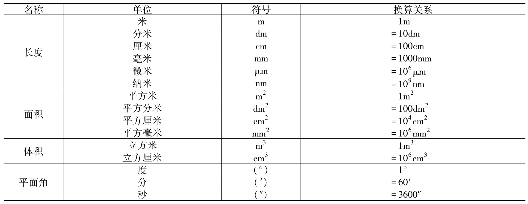 常用计量单位换算包括长度、面积、体积、平面角等,见表2-7。