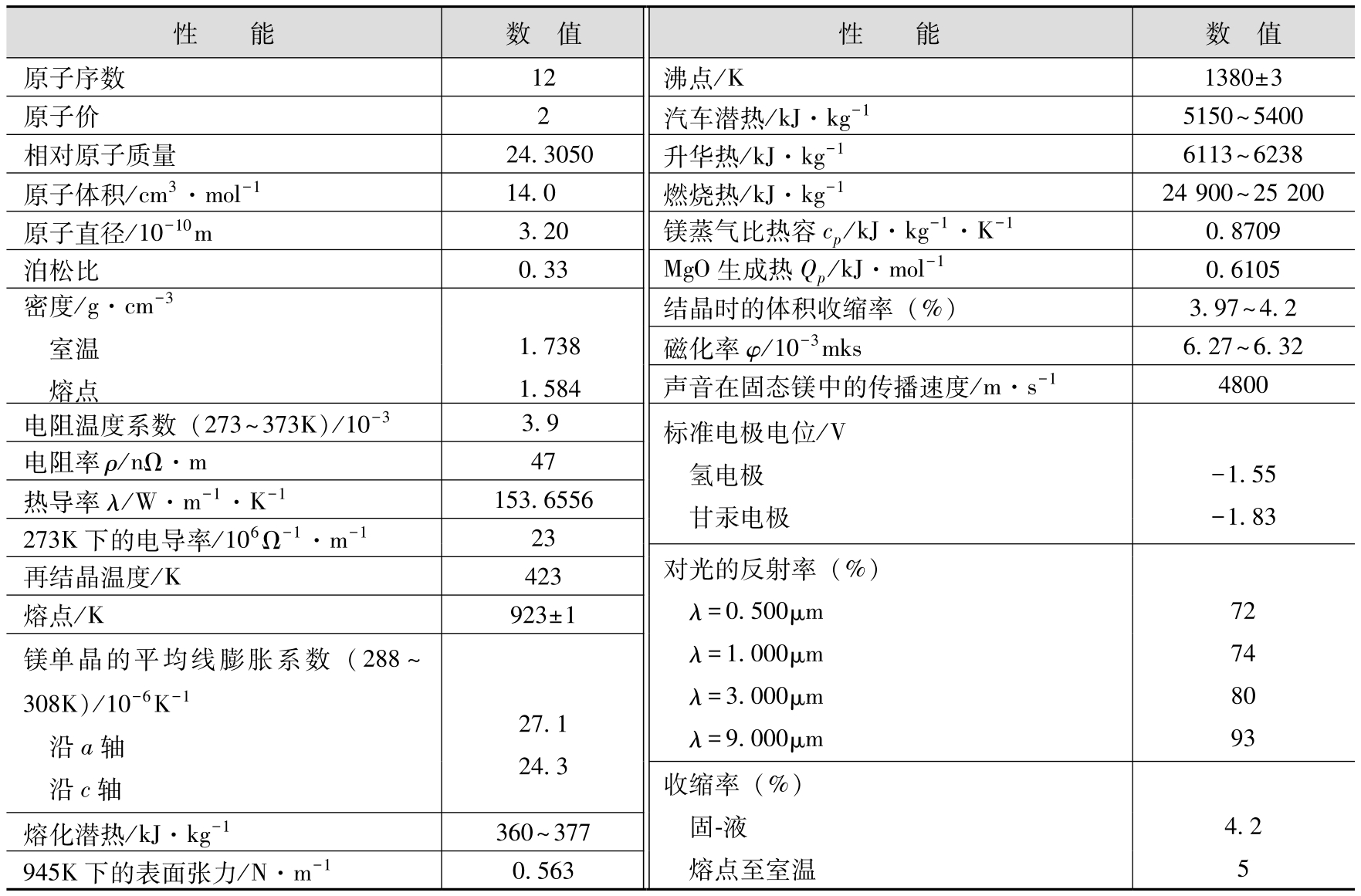 镁在门捷列夫元素周期表中属于ⅡA族碱土金属,呈银白色。镁的晶体结构和镁原子的核外层的电子构造决定了镁及其合金具有特殊的物理化学性能和力学性能。表1-1给出了镁的物理性能。
