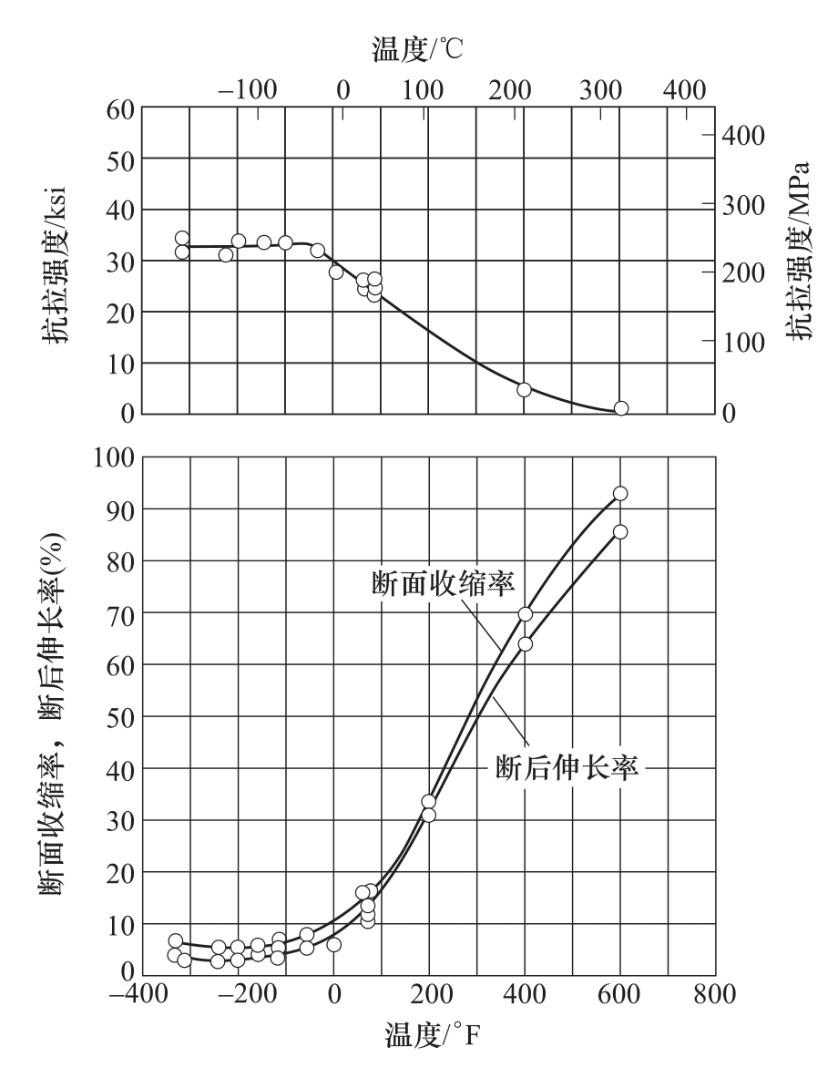 镁的力学性能与组织形态有关,变形加工后力学性能明显提高。表1-3给出了镁的力学性能。表1-4给出了镁的不同状态在室温下的力学性能。图1-3所示为镁的弹性模量与温度的关系。图1-4所示为镁的拉伸性能与温度的关系。