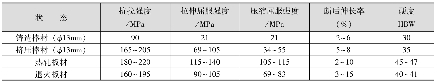 镁在铸造状态下晶粒比较粗大,平均直径可达1.5mm。图1-2所示为镁再结晶平均晶粒直径与加热温度之间的关系。镁中的主要杂质为Fe(<0.059%)、Ni(<0.026%)、Pb(<0.006%)、Cu(<0.003%)等。在225℃以上变形时,镁的塑性显著提高。不同温度下铸造状态的镁的流变应力与应变量和应变速率之间的关系在表1-2中给出。