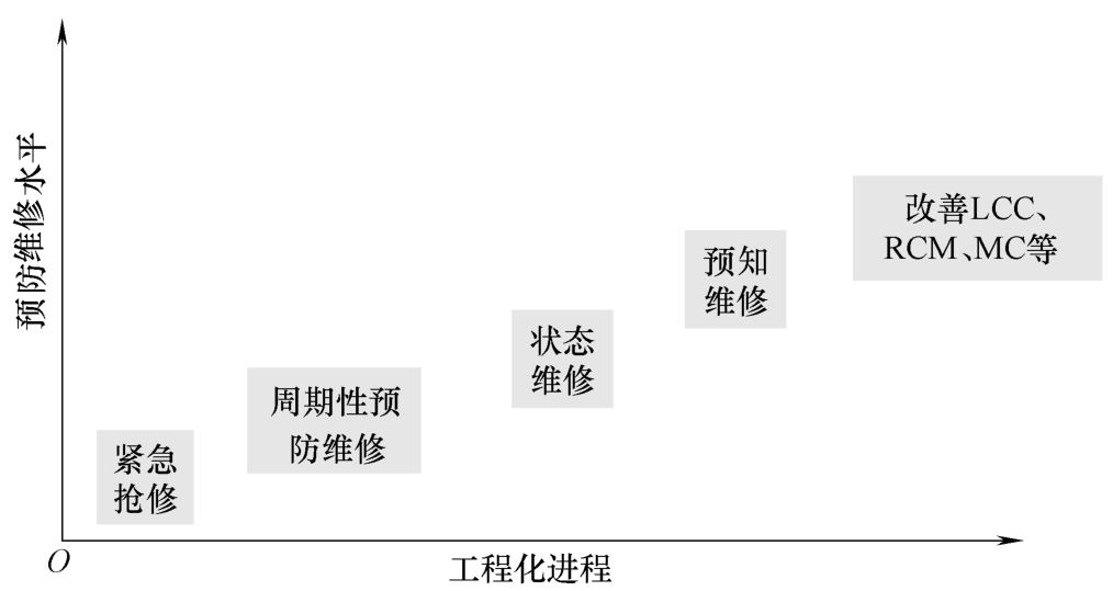 维修工程化进程如图2.2-1所示。由图中所见,预防维修水平最低也是工程化程度最低的阶段即紧急抢修;随着预防维修水平的提升和工程化的发展,分别进入周期性预防维修、状态维修、预知维修,最后达到改善LCC、RCM、MC 的最高阶段。其中,LCC为寿命周期费用,RCM为以可靠性为中心的维修,MC为维修持续改善。