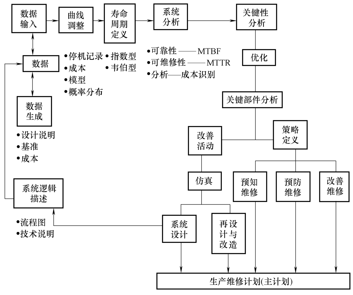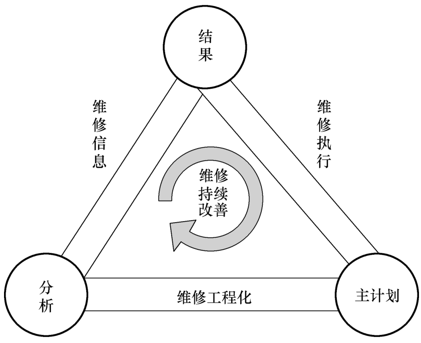 有效维修的基础是通过主计划—维修工程化—分析—维修信息—结果—维修执行的循环和不断改善来实现的。这里,维修工程化是将设备信息按照以上各阶段的描述做工程化的梳理,最后落实到实施主计划中,然后通过不断地维修实践,对数据进行分析,持续地改进和完善。有效维修的基础如图2.2-2所示。维修工程的详细展开概念流程如图2.2-3所示。这里,MTB F和MTTR 分别代表平均故障间隔期和平均修理时间。