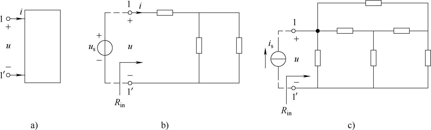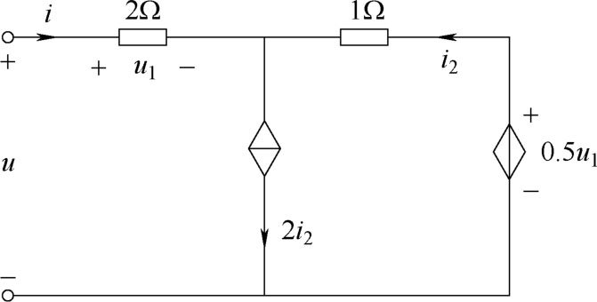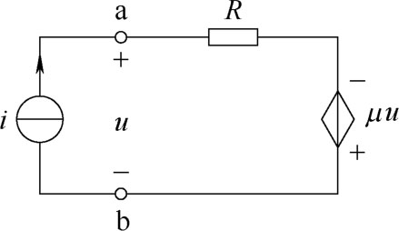 如果一个二端口网络内部含电阻,则应用电阻的串、并联和Y-△变换等方法,可以求得它的等效电阻。如果二端口网络内部除电阻以外还含有受控源,但不含任何独立电源,可以证明(见3.3节),不论内部如何复杂,端口电压与端口电流均成正比,如图2.6a所示,定义此端口的 输入电阻 为
