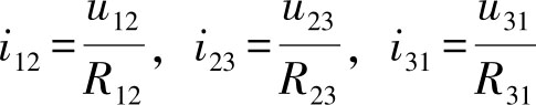 由于两个等效电路对应的端子电压、电流均相等,故式(2-1)与式(2-2)中电压 u 12 、 u 23 、 u 31 前面的系数应该对应相等。于是得到