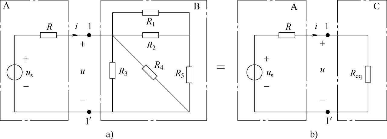 用等效电路的方法求解电路时,需要注意的是“ 对外等效 ”的概念。电压、电流和功率保持不变的部分仅限于二端网络以外的电路。等效后的电路与原来的部分显然是不同的,例如把图2.1a所示电路简化后,不难按图2.1b求得端子1-1’左部分的电流 i 和端子1-1’的电压 u ,它们分别等于原电路中的电流 i 和电压 u 。如果要求图2.1a中B部分电路的各电阻的电流,就必须回到原电路,根据已求得的电流 i 和电压 u 求解。所谓“对外等效”也就是对端口外部电路的作用效果相等。