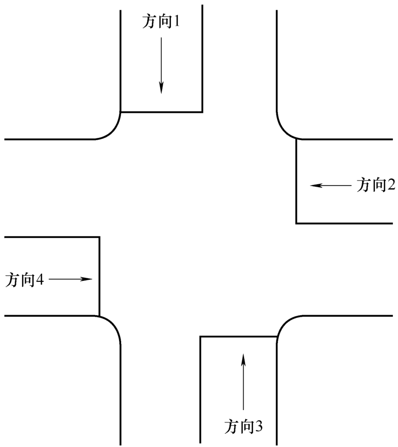 选取典型两相位控制的单交叉口进行建模研究,交叉口的相位分别为“东西直行”和“南北直行”,如图2-1所示。