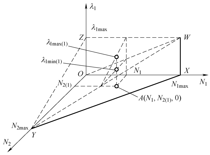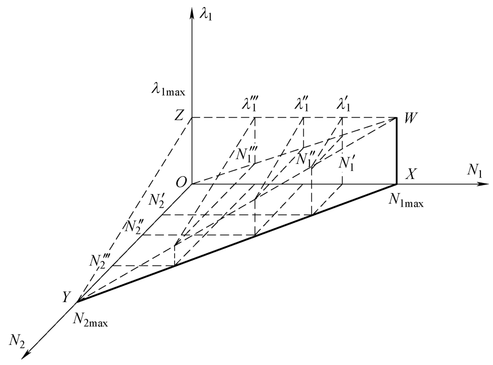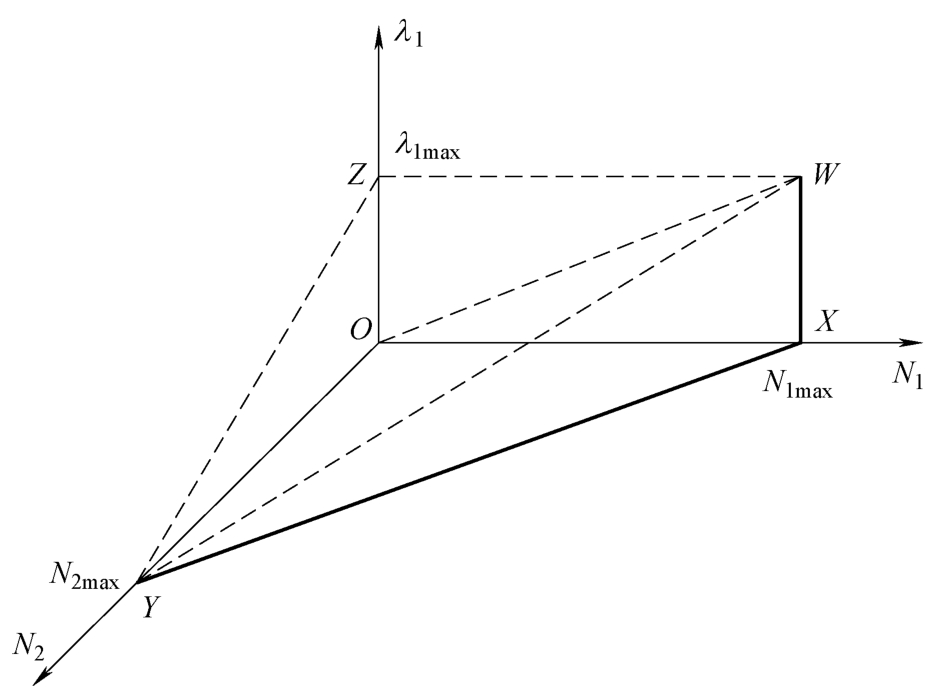 Δ OWX 为锥体 OWXY 在 N 1 —λ 1 平面上的投影。其表示,当相位1流量固定,随着绿信比 λ 1 增加,相位1的通行能力增加。边 OW 为对应流量随绿信比最小值所形成的边。那么,有