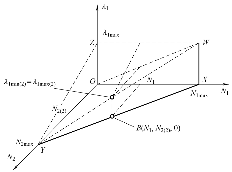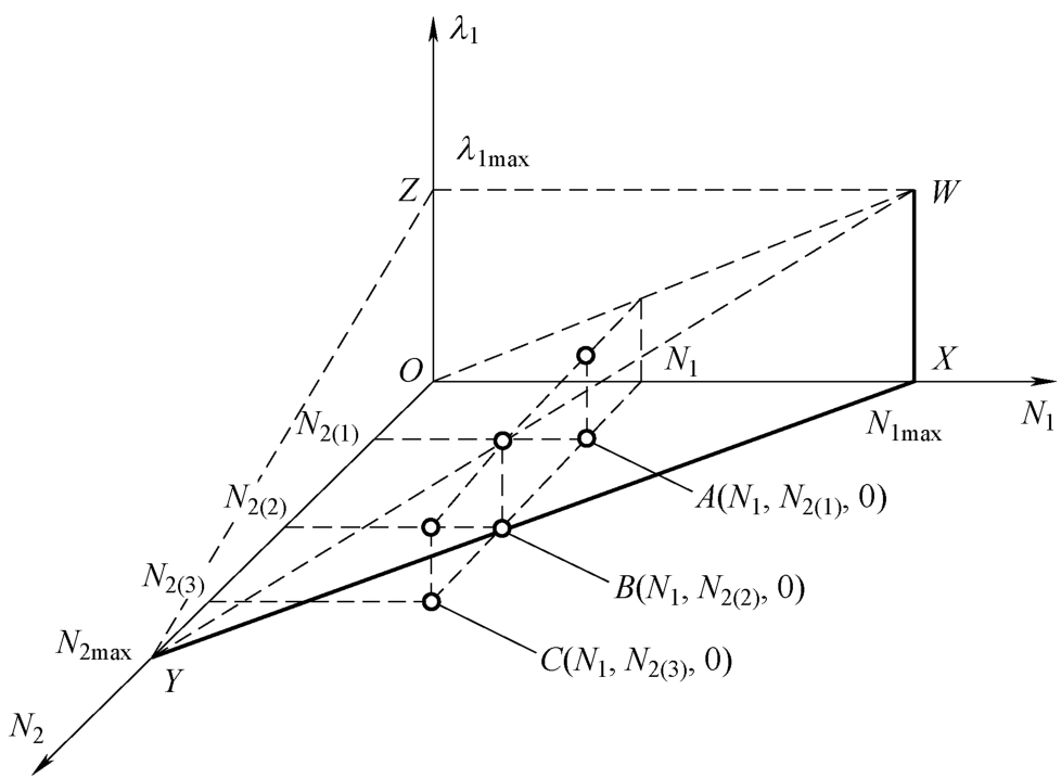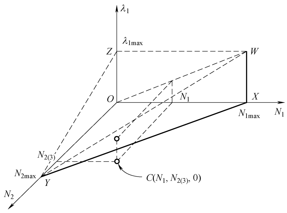 Δ OYZ 为锥体 OWYZ 在 N 2 —λ 1 平面上的投影。当相位2流量固定,随着绿信比 λ 1 增加,相位2的通行能力减小。边 YZ 为对应流量随绿信比最小值所形成的边。那么,有