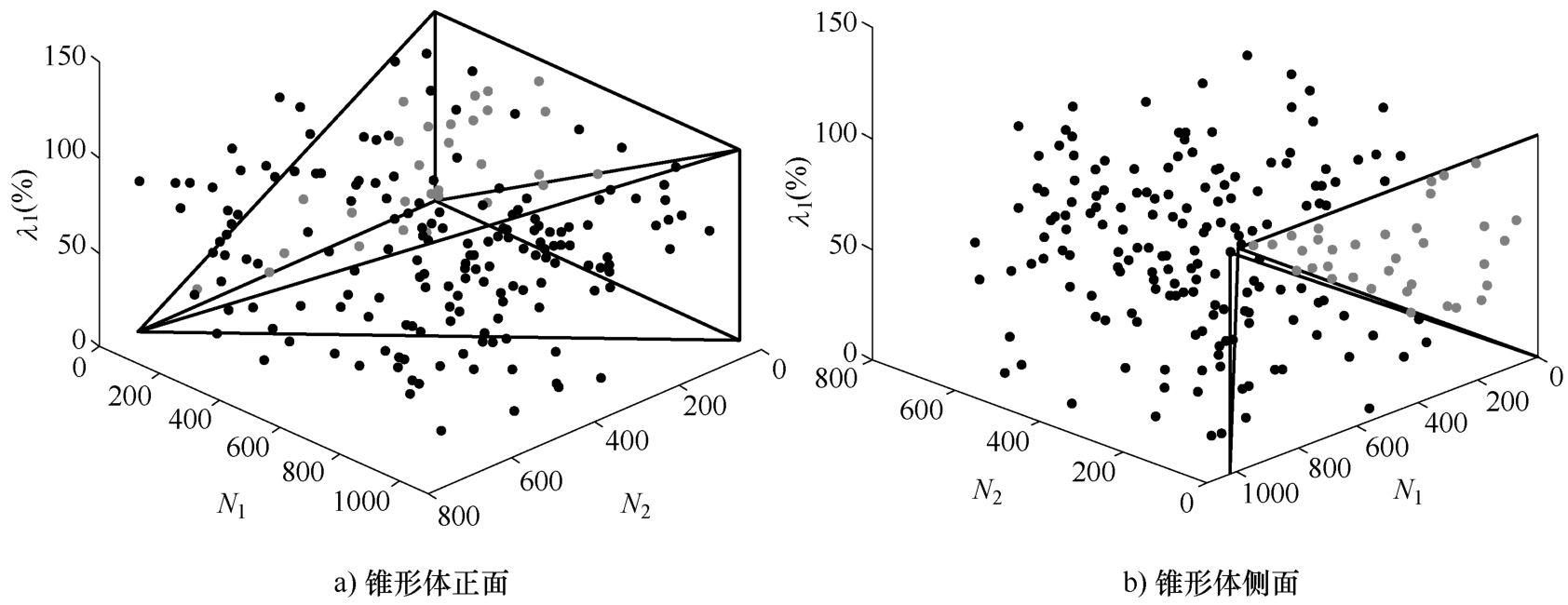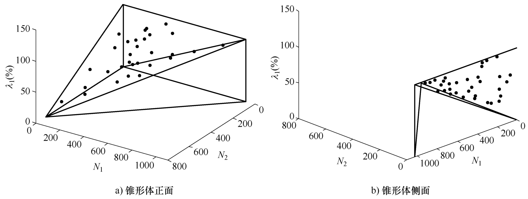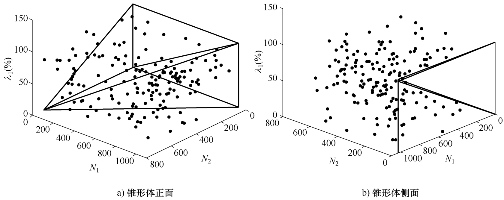 令 N 1 = x 、 N 2 = y 、 λ 1 = z ,将“流量-绿信比三维关系图”等同于三维空间坐标图。对于一个三维空间坐标点{ x , y , z }必在该坐标图内,可知三维关系坐标点{ N 1 , N 2 , λ 1 }也必在流量-绿信比三维关系图内。因此,可以进行以下描述:一个典型的2相位控制交叉口可用“流量-绿信比三维关系图”进行分析,内部点坐标为{ N 1 , N 2 , λ 1 }。