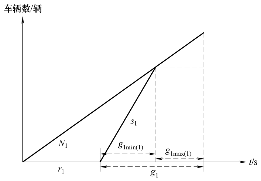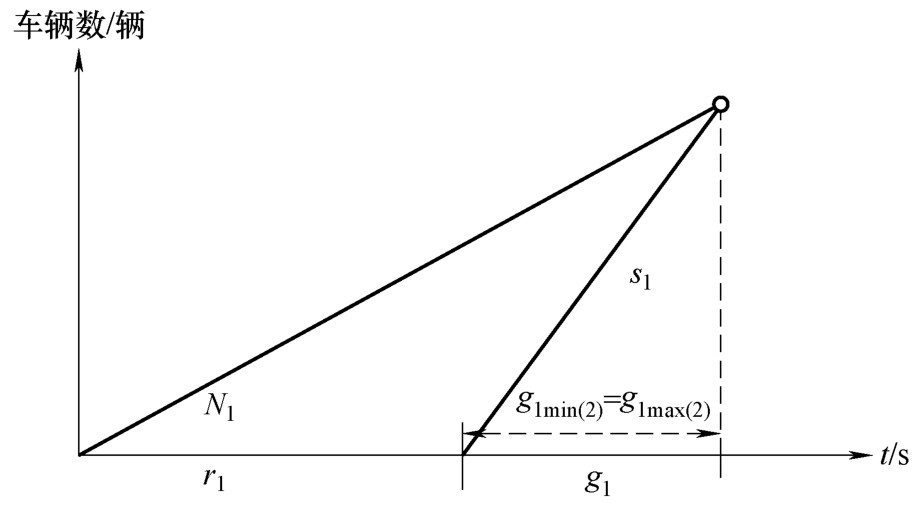 如图2-8所示,当相位1和相位2的流量为{ N 1 , N 2(3) }时,相位1不存在绿信比 λ 1 ≥ λ 1min(3) 使得各相位所有到达车辆均能在相位绿灯时间内通过交叉口。
