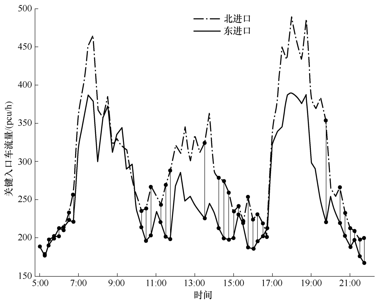 利用所提方法对学院南路和交大东路交叉口的交通状态进行界定,其中该交叉口周期 C =70,南北方向的绿信比 λ 1 =0.44,饱和流量 N 1 =1025pcu/h,东西方向的饱和流量 N 2 =712pcu/h,如图2-17所示。图中,黑色点位表示交叉口处于欠饱和状态下的北进口和东进口流量,其余部分为交叉口处于过饱和状态。
