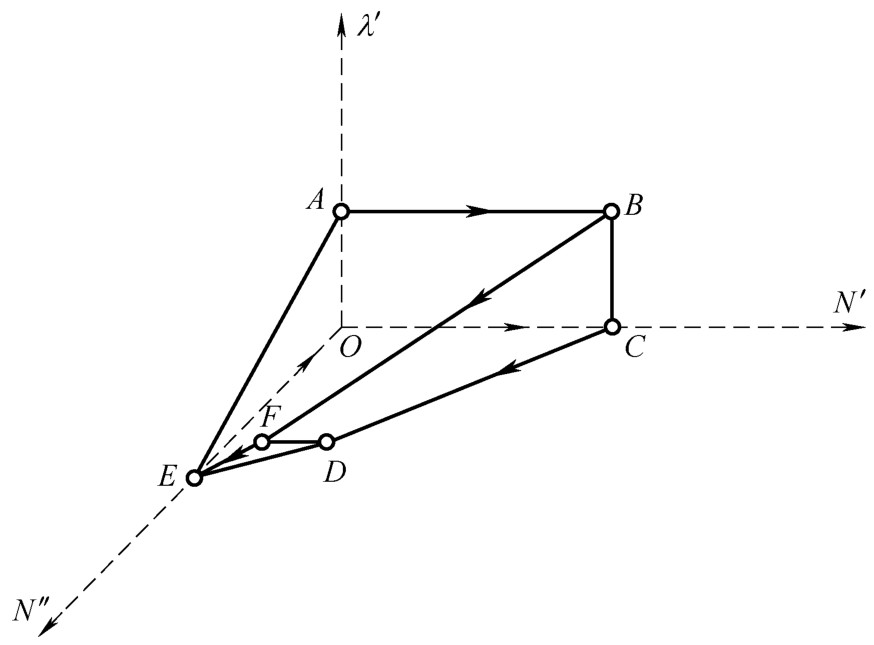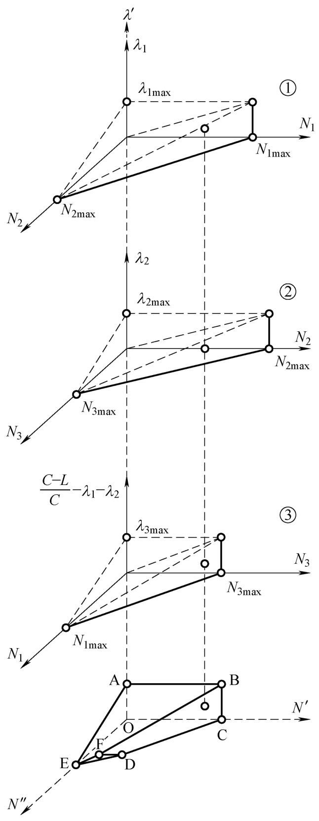 如图2-14所示,在投影形成的多面体内部 ABFEDCO 取一个点的集合{ N ′, N ″, λ ′},反投影到三维关系空间集合体{①,②,③}中,如图2-15所示。