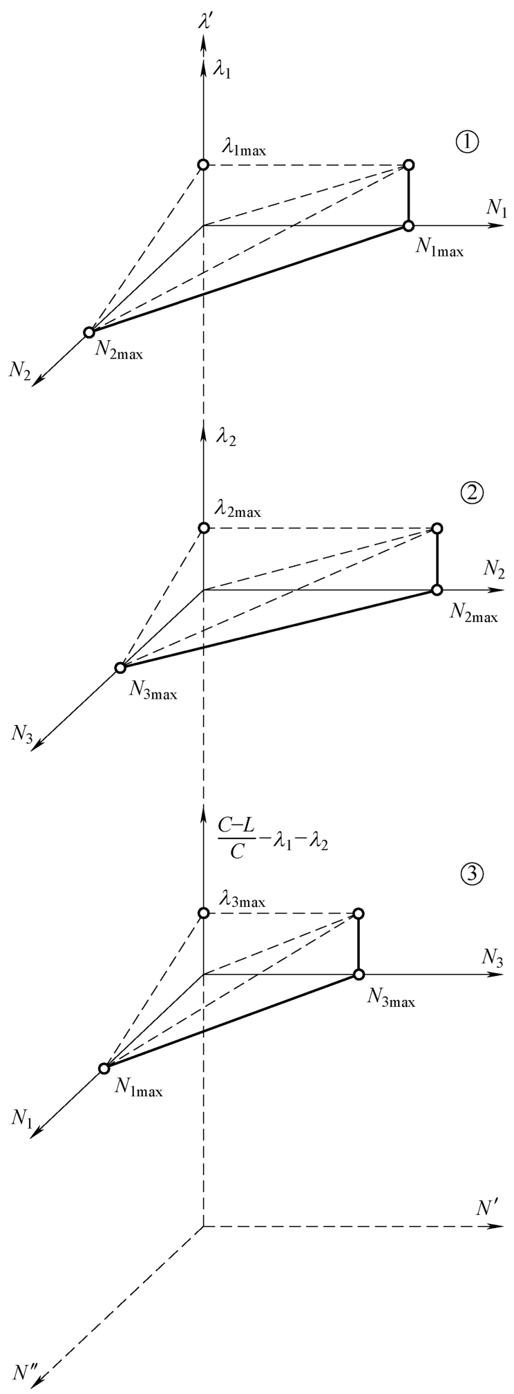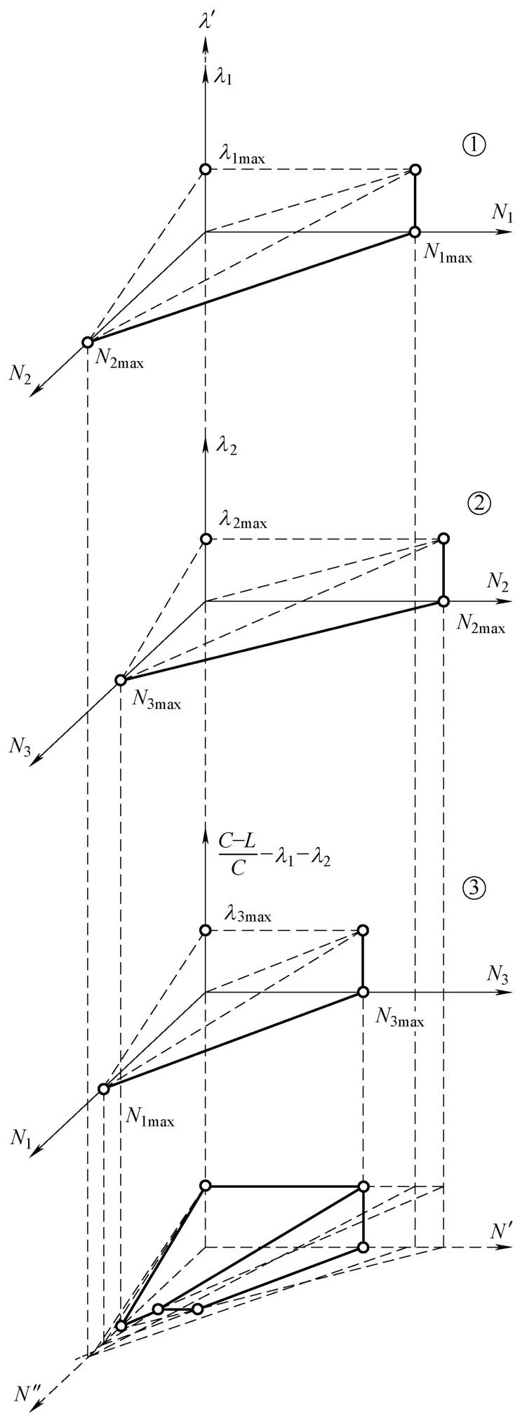 将多相位交叉口分解所得到的三维关系空间按照 N i = N ′、 N j = N ″、 λ n = λ ′对应投影到一个标准三维坐标空间内,可以形成一个投影空间的集合,该集合便是多相位交叉口欠饱和交通状态的集合。两相位控制交叉口所能分解的三维关系空间只有一个,就是其所形成的流量-绿信比三维关系图,因此无须投影。下面以三相五维关系空间为例进行详细描述。