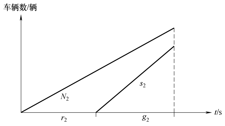 如图2-9所示,若交叉口无初始排队,当相位1和相位2的流量为{ N 1 , N 2(3) }时,相位1在绿灯时间为 g 1 = g 1min(3) = g 1max(3) 可以完全清空到达的车辆,但相位2在绿灯时间为 g 2 =[0, C-L-g 1 ]的范围内取任何值均不能清空到达的车辆。