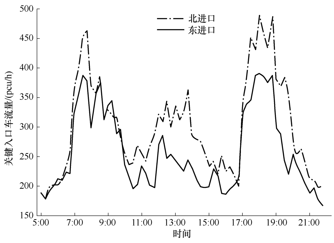 为了验证本节所提出的交叉口交通状态判别方法的准确性,选取北京市学院南路和交大东路交叉口东西和南北两相位的交通数据进行仿真验证。该交叉口两个方向5:00~21:00的交通流数据如图2-16所示[(每15min采集一次,折合成标准车当量数(pcu)]。