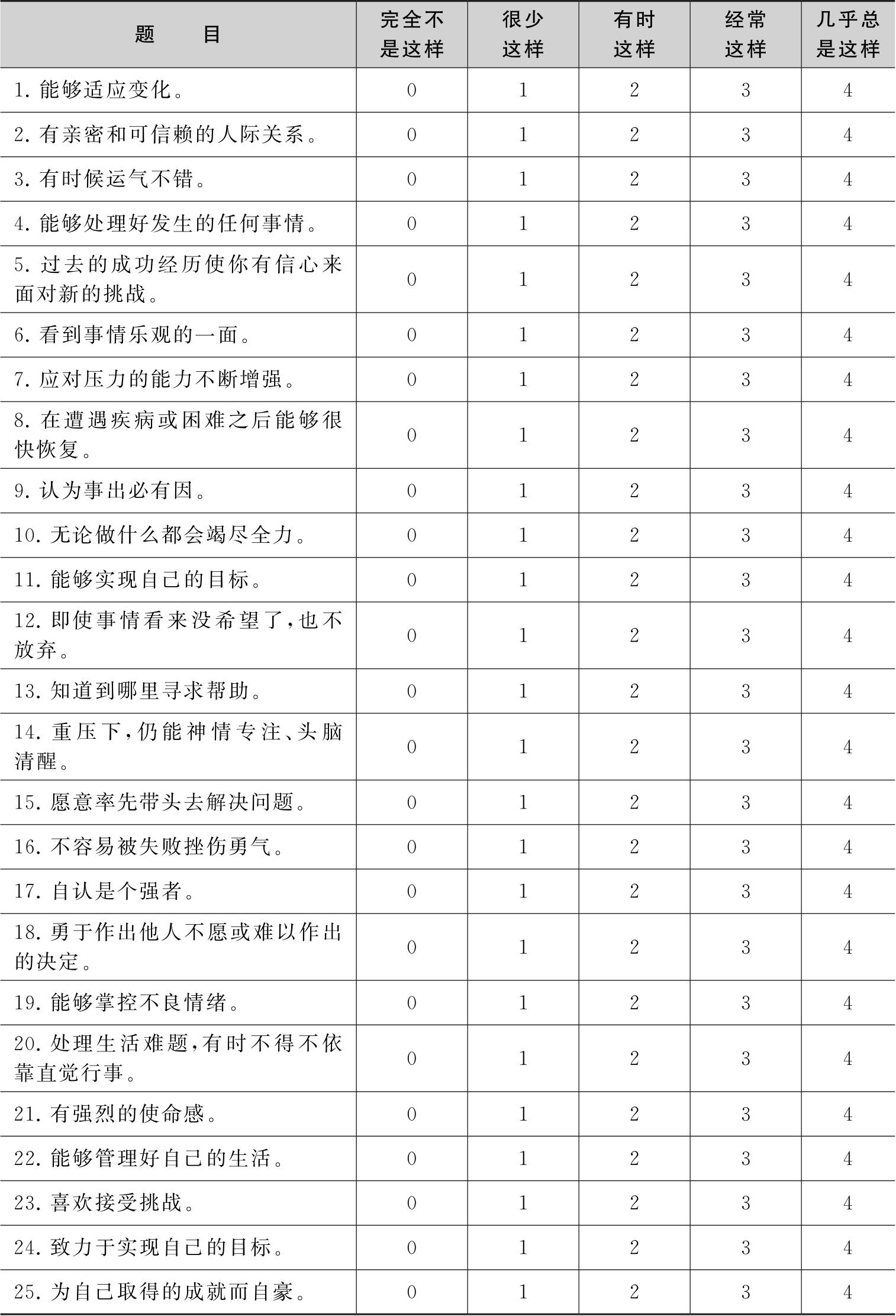 心理韧性的测量工具相当多,在国内外发表的众多心理韧性标准化量表中,Connor-Davidson韧性量表已经过多次的实证研究,被认为是良好的测量工具之一,曾在美国的研究中显示出良好的心理测量学特性,并反映了创伤后应激障碍患者经过治疗后的全面改善状况(Davidson et al.,2005)。