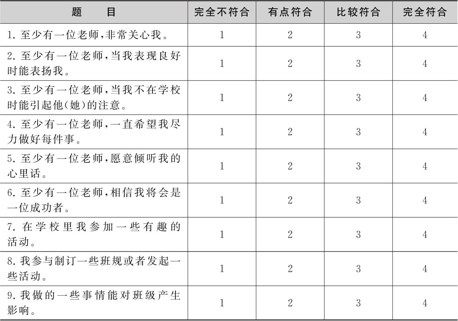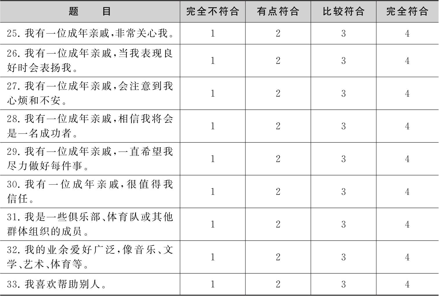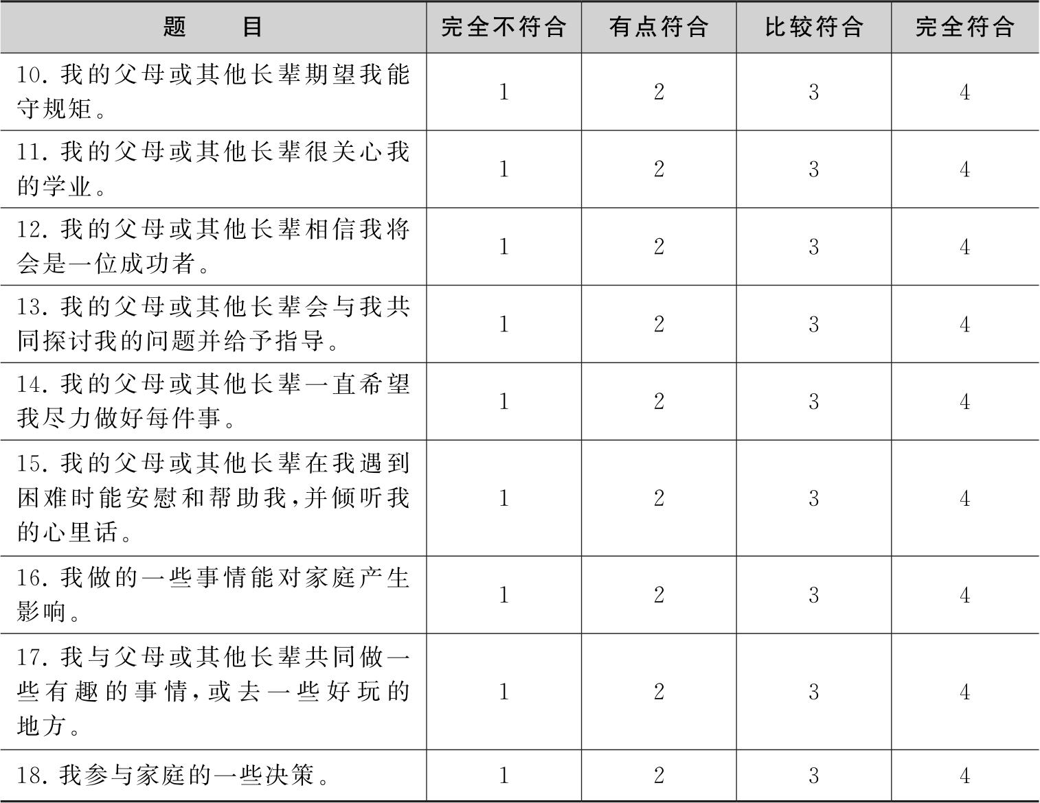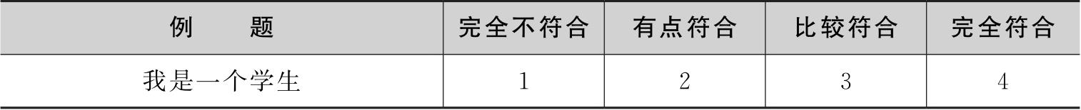 指导语:所有的项目采取1~4四级计分方法作答,1代表“完全不符合”;2代表“有点符合”;3代表“比较符合”;4代表“完全符合”。