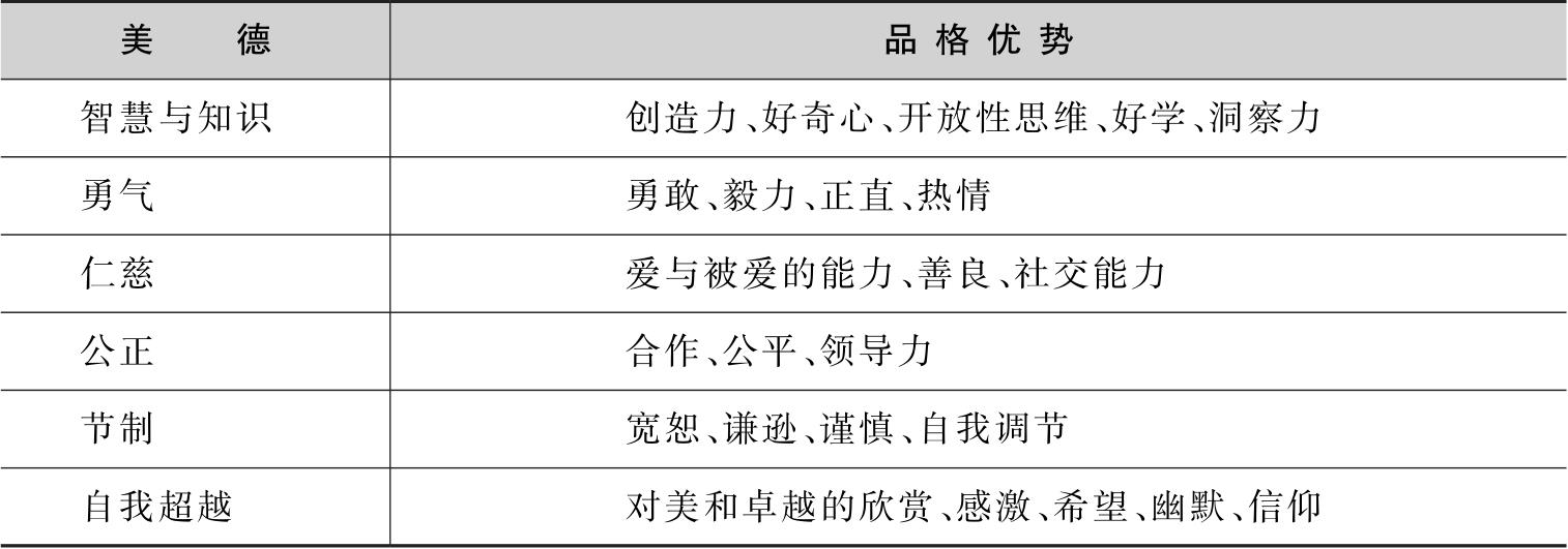 人类的积极人格特质对日常工作和生活至关重要。品格优势由Perterson和Seligman(2004)提出,部分中国学者将其译为“性格优势”,描述了24种积极人格特质,这些人格特质通过认知、情感和行为反映出来。这些品格优势是先由多名心理学家从世界的哲学、宗教和文化体系中提炼出六大美德——智慧与知识、勇气、仁慈、公正、节制和自我超越,随后从六大美德中遴选出24种品格优势,因此它们被认为是在不同文化下普遍存在的。品格优势的跨文化一致性也得到了实证研究的验证(Park,Peterson & Seligman,2006)。