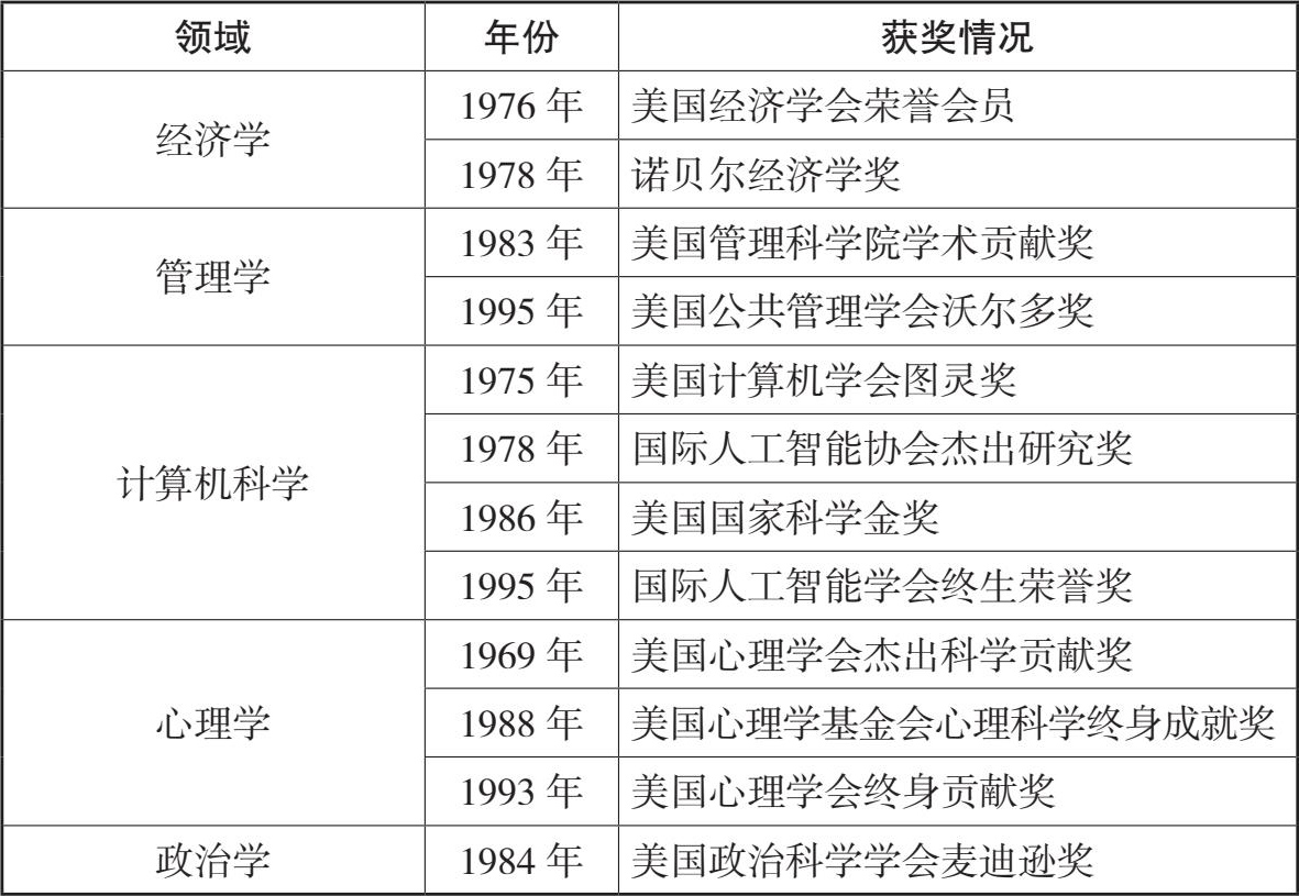西蒙在很多科学领域都有建树,各个领域的世界级大奖他也拿过不少,西蒙获奖情况如表1-1所示。