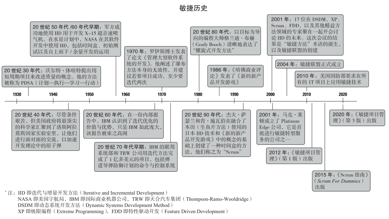 敏捷技术萌芽的产生已经有很长一段时间。事实上,敏捷价值观、原则和实践只是对常识的汇编。图1-2展示了敏捷项目管理的历史,最早可以回溯至20世纪30年代沃尔特·休哈特(Walter Sherwart)在项目质量方面的计划—执行—学习—行动(PDSA)方法。