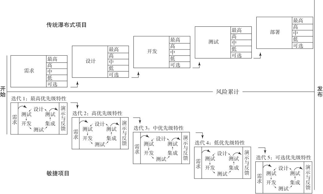图1-3展示了线性瀑布式项目和敏捷项目的区别。