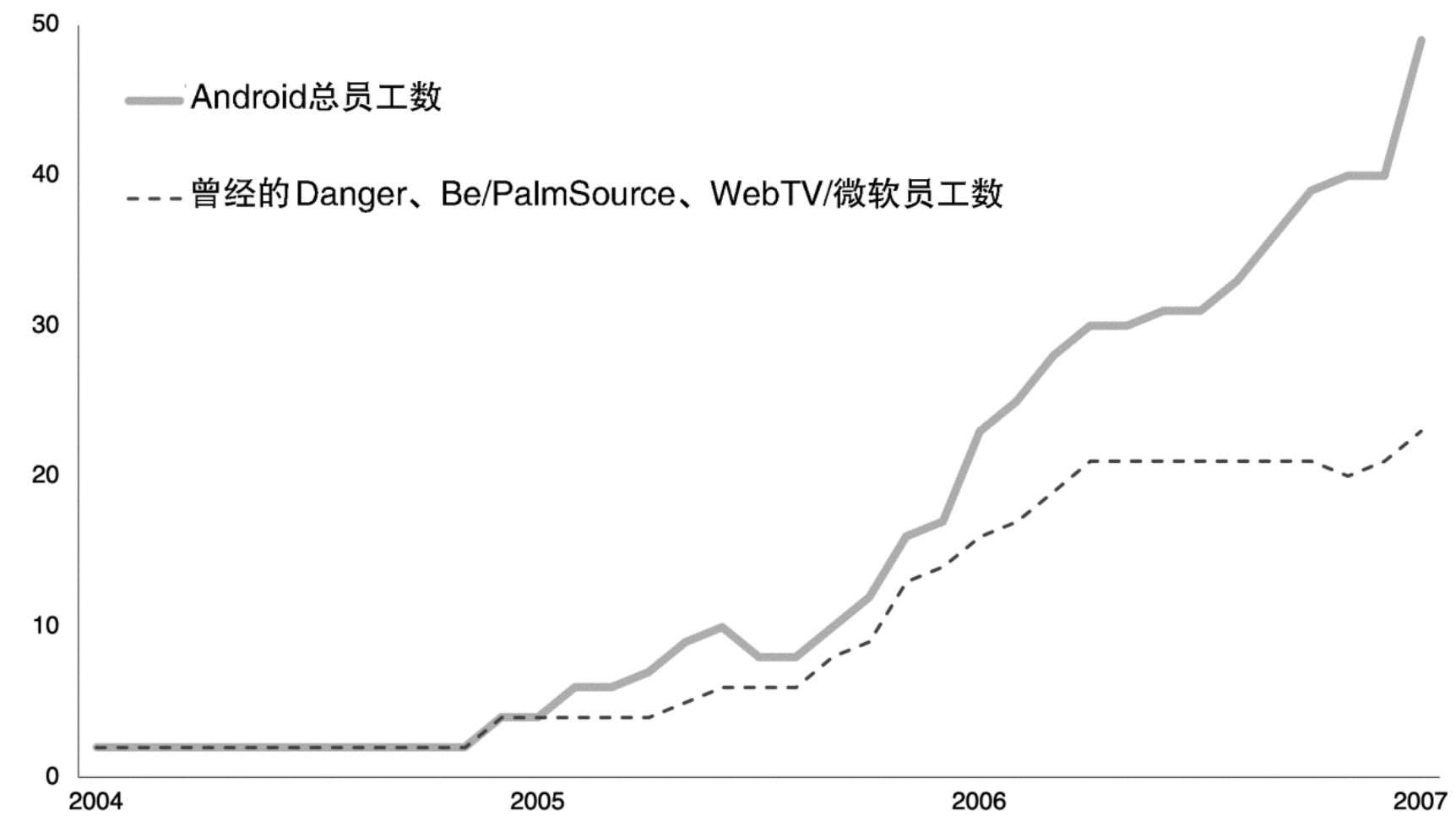 大多数早期的Android团队成员都曾在这些公司工作过:Be/PalmSource、WebTV/微软和Danger。到2006年年中,这些人至少占团队70%的比重,并且在2007年之前一直都是团队的主要成员。