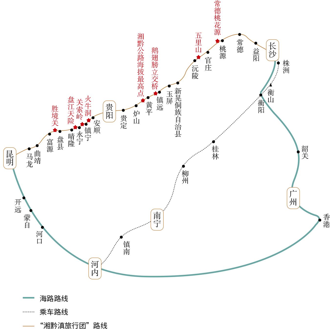 长沙临时大学(西南联大前身)师生从长沙到昆明的路线图