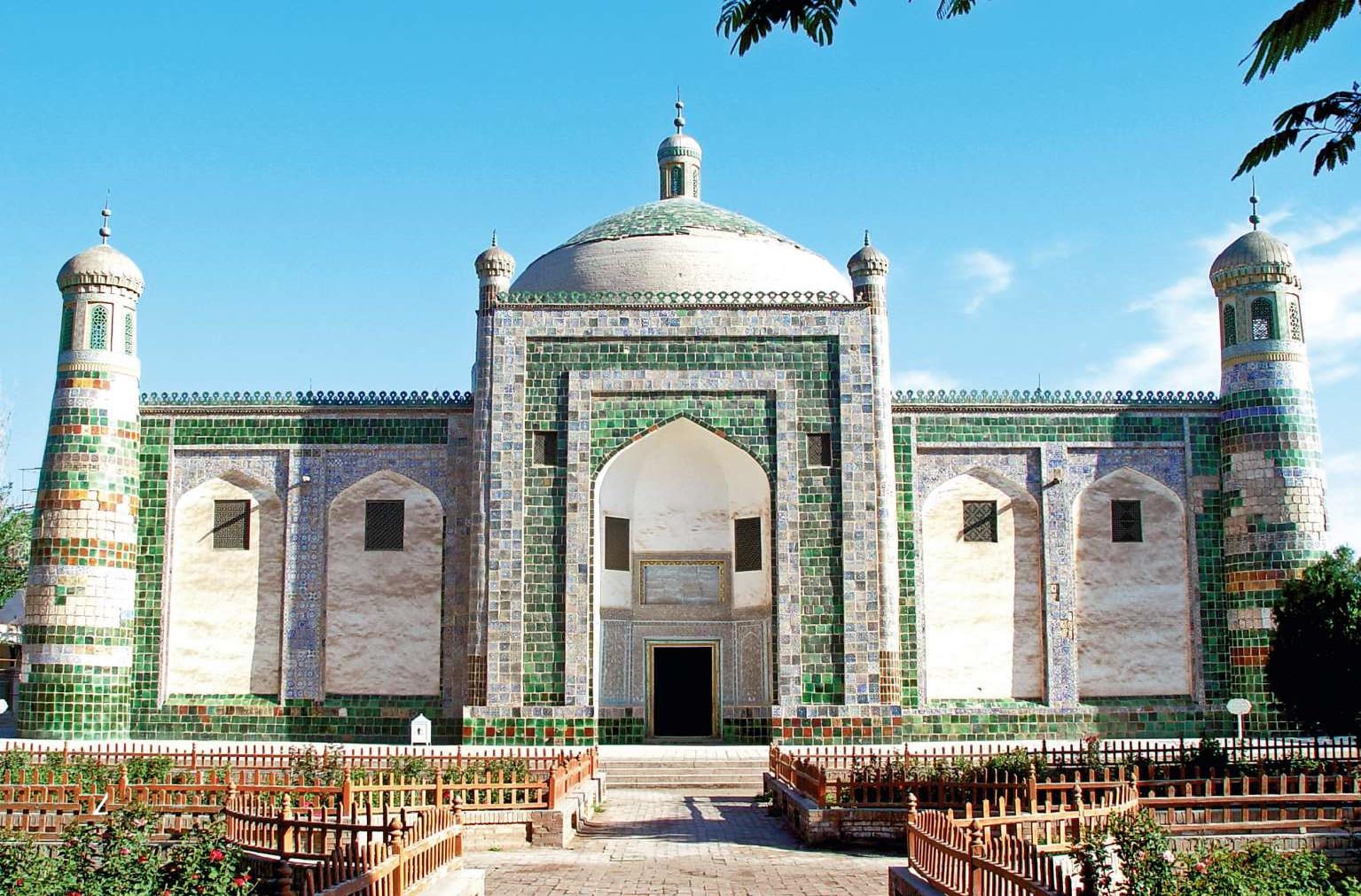 传说的香妃墓在城郊,这里是一个麻扎,也就是穆斯林先圣的墓地,香妃(和卓氏)实际上葬在河北遵化的清东陵。伊斯兰教在公元10世纪从陆路传入新疆,其建筑风格也随之而来,以清真寺和陵墓最具代表性。阿巴克霍加麻扎就是典型的中亚建筑,样式和装饰令人赞叹:穹顶、马赛克贴面、蓝花瓷图案。