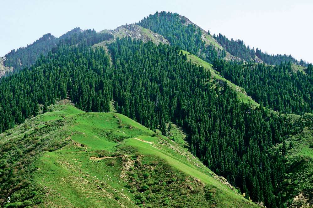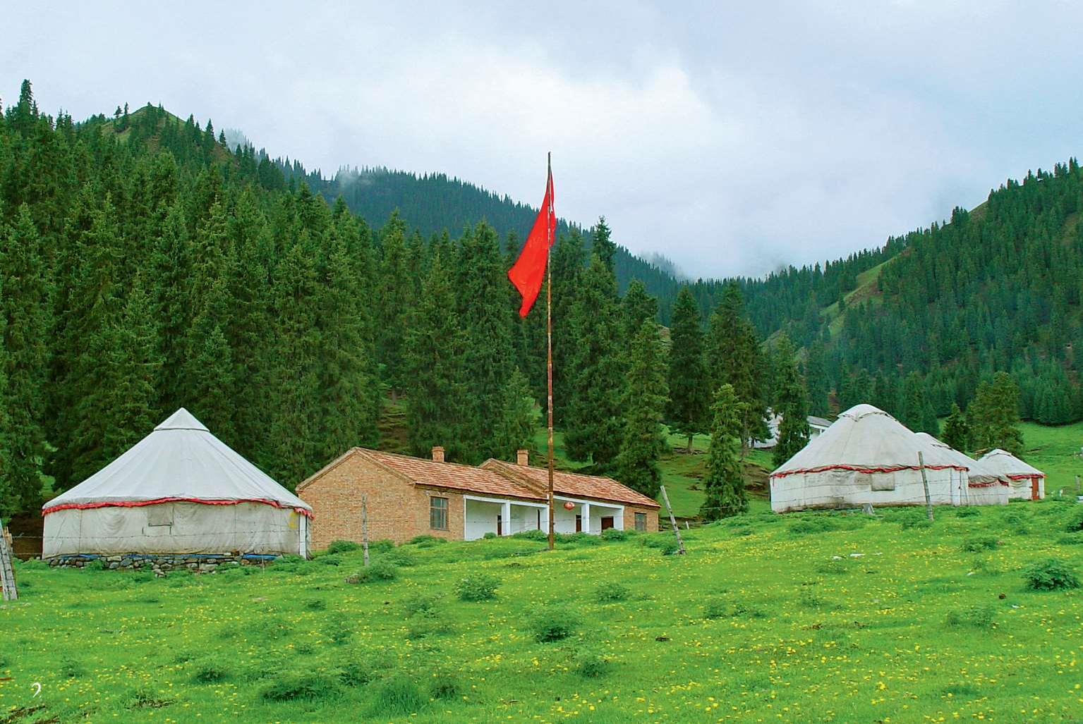 这时下起雨来,我们赶紧把标本包装好,再沿道路前进。雨天路滑,很难行,我们一直向南往山根方向,希望看另一个地点。这里的道路都是开煤矿所用,直到驶上山根的国防公路,条件才有所改善。绿草如茵,衬托着高耸入云的针叶林,是天山最迷人的景色,考察队中来自美国堪萨斯大学的苗德岁博士就被完全迷倒了。草地和森林阻止了水土的侵蚀,造就了哈萨克民族的牧场。在湿润的空气中座座毡房像是绿野上勃勃生机的白蘑,那一面迎风飘逸的红旗灿然明亮了被雨雾迷茫的苍穹。可是雨还在不停地下,雾也使能见度降到最低,只能往回走,花费了相当长的时间才回到奎屯。