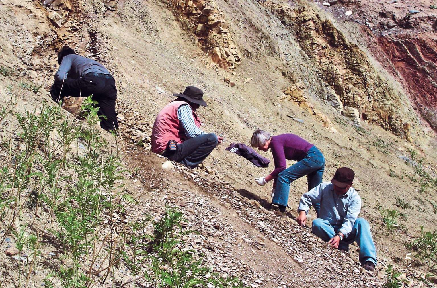5傅睿思院士(右2)、苗德岁博士(右1)和冯文清高工(右3)等在采集化石(高伟摄)