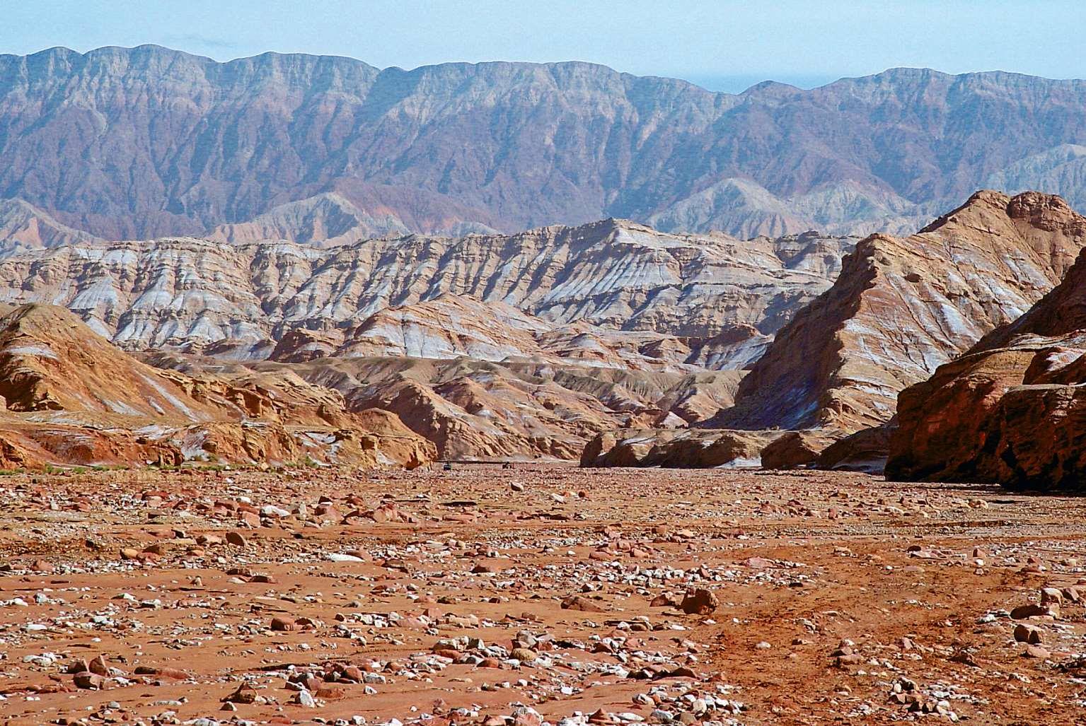 房间里没有水,外面的盥洗间也没有,早晨只好用矿泉水漱个口,脸就不洗了。早餐是四川小店的拌面,只不过是新疆风味,不是四川的做法。从西克尔出发向西到大山口方向,经过铜矿,路的北侧是第三系的红色地层。