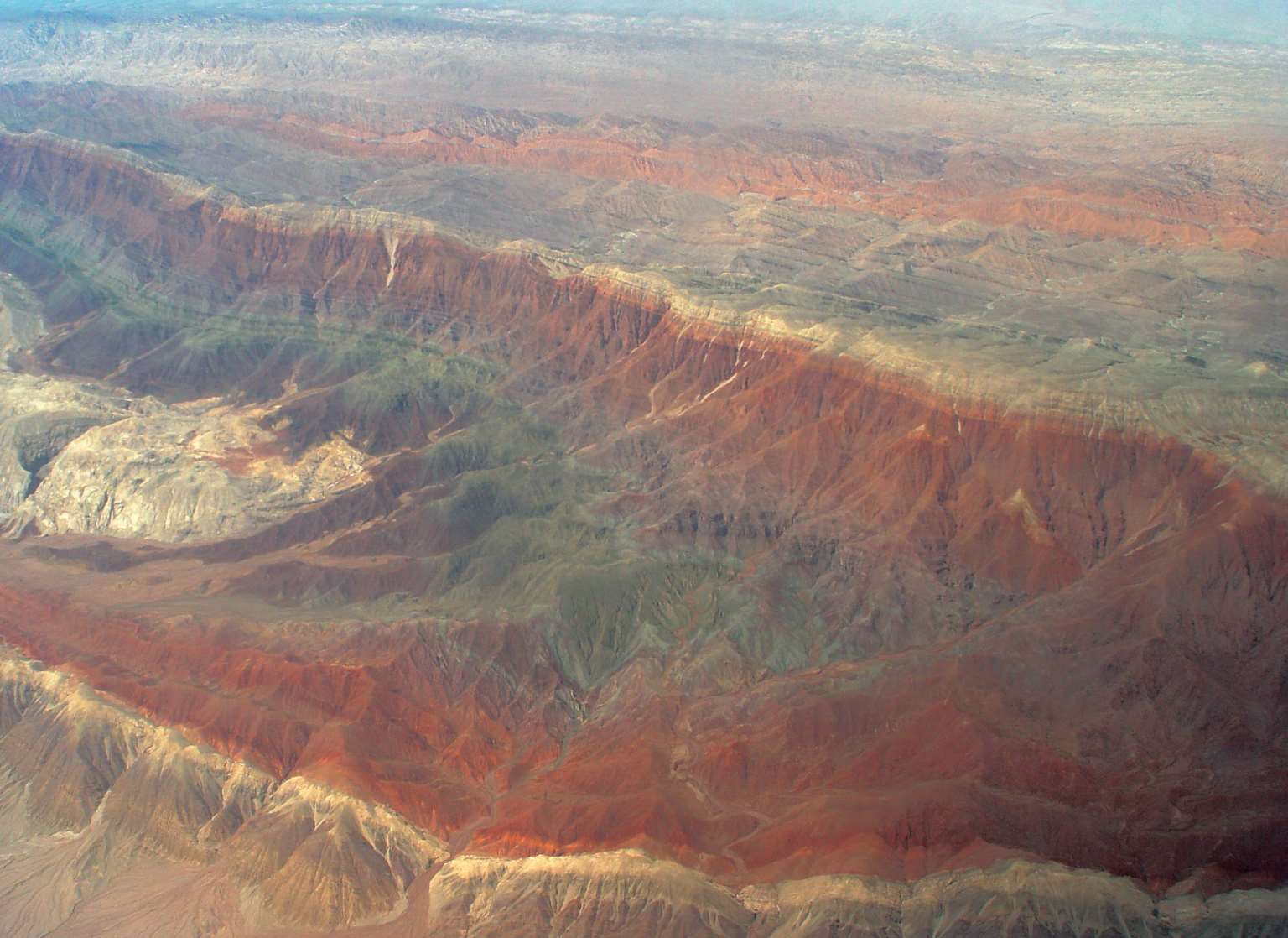 12点之前到达乌鲁木齐机场,在等待航班的时候看了喀什一带的新生代研究论文,对相关的地层有了更清楚的认识。起飞了,乌鲁木齐上空的污染很严重,天气也不好,大部分航程都浓云密布。飞行高度不大,特别颠簸。直到飞过天山,到达喀什附近,云层才消散,可以清楚地看见下面的红色岩系。