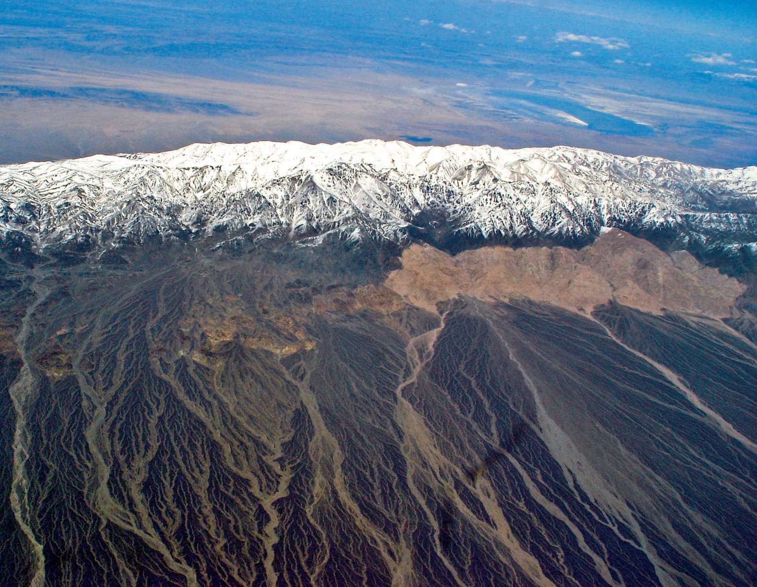 回程航线上的天气比来时要好,那些看过的地层可以从空中做大视野的观察,构造清晰可见。天山的冰雪世界和山下的一座座绿洲列队检阅一般,使人久久难忘这独特的自然景观和迷人的西域风情。