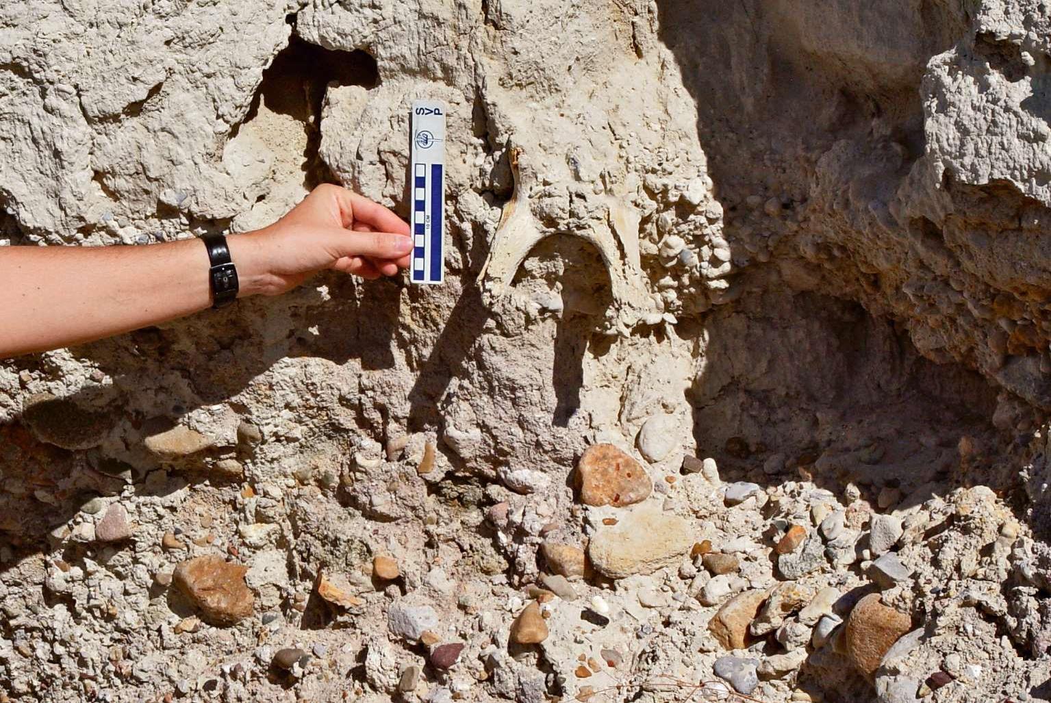 我们接下来将车一直开到拉斯维加斯北面的山根,这里是一片巨大的冲积扇。扇上有一条大的冲沟,切出扇下部的白色地层,是更新世的沉积,里面发现过哺乳动物的化石,已经有一个世纪的研究历史。1903年最早报道的是象化石,当时认为是乳齿象,现在判断可能是猛犸象。随后在1919年又发现了真马和野牛的化石,还有已灭绝的北美狮。这些材料也是最早在拉斯维加斯地区发现的脊椎动物化石,现在收藏在伯克利的加州大学古生物博物馆。