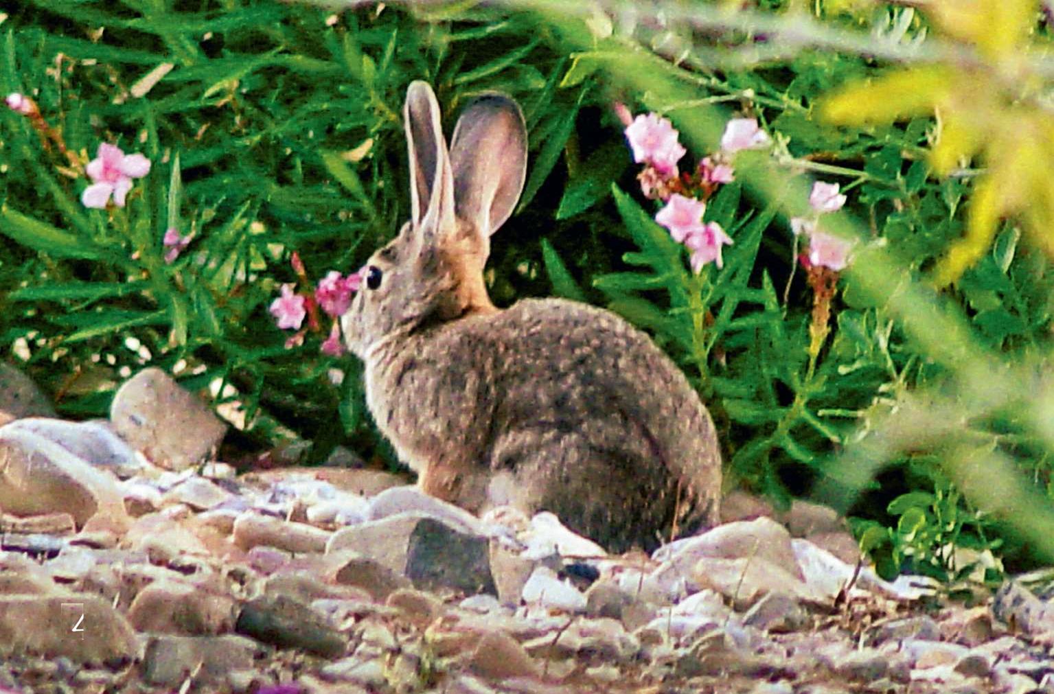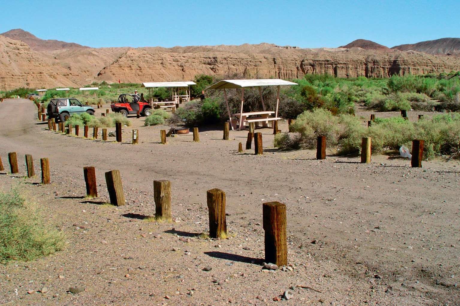 中午在一处荒漠国家公园野餐,这里没有服务人员,但露营的设施准备齐全,游客可以自助使用。考察队已采购了食物和饮料,美国人的习惯是很多东西都要冰镇的,所以皮卡车上就在保温箱内预备了不少冰块。公园建在季节性河流的河床上,现在没有流水,但灌木生长得很茂盛,其中建了一系列的凉棚。灌木边上都有木质的隔离桩,禁止车辆驶入,避免对植物造成损害。我们吃饭时,北美花鼠( Tamias )就在四周转悠,寻找可能的食物。