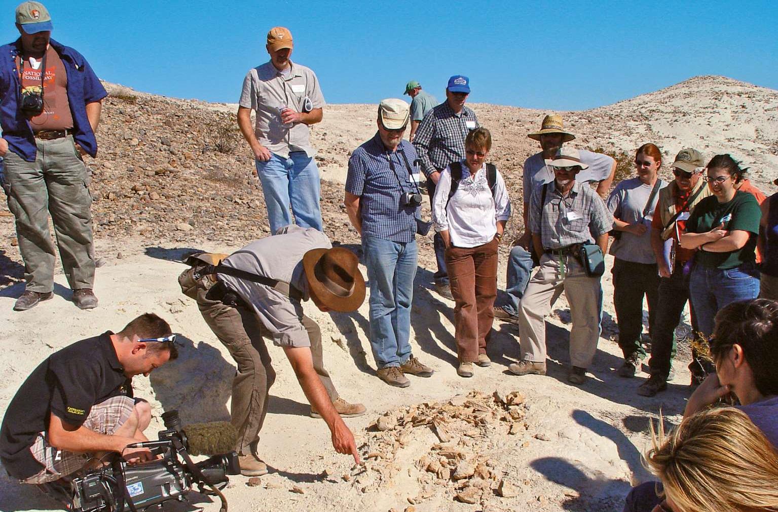 我们在这里的考察内容都与地质背景相关,特别是大量发育的泉华沉积,想象得到这里曾经是水草丰茂之地,如今变成了荒漠。我们参观了两个发掘点,其中一个正在进行。在图尔(Tule)泉地点,晚更新世化石相当丰富,因此得到一个“骨堆”的绰号,发现的材料包括一雌一雄两个已灭绝野牛的骨架,还有骆驼、北美狮( Panthera atrox )、地懒和野兔的化石。这个地点被解释为一个涌泉或者泉水沼泽,野牛不幸掉入其中而亡。